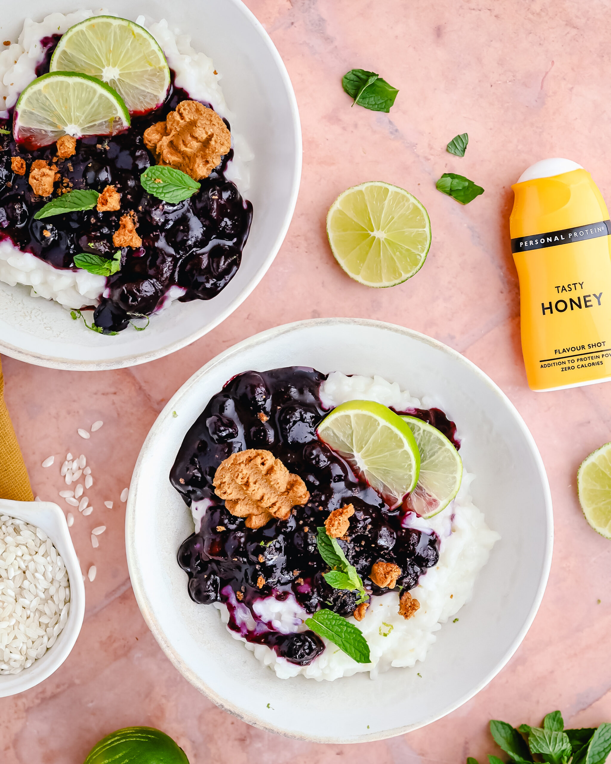 - Verdeel de rijstpudding over twee schaaltjes, doe hier de blauwe bessen overheen. Maak af