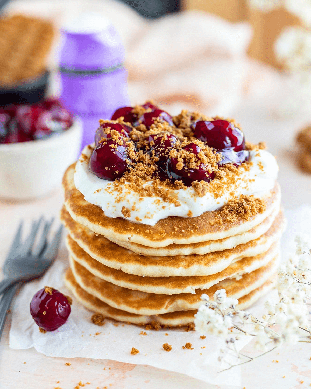 4. Meng in een kom de magere kwark, zuivelspread en 2 vanille flavour shots. Verdeel de pancakes over de borden. Garneer met het kwarkmengsel, de kersen en verkruimel de Bastogne koekjes eroverheen.
