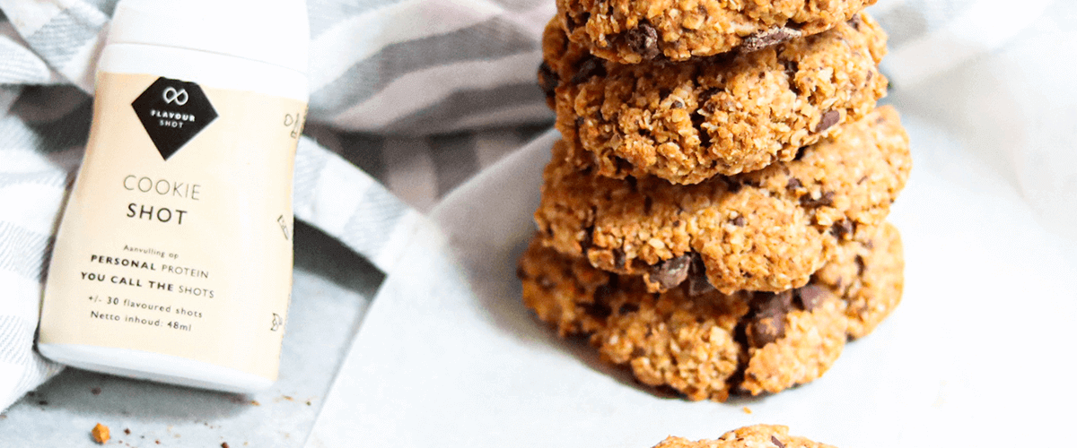 3. Voeg het geheel in een grote kom, smelt de roomboter en voeg dit toe aan de droge ingrediënten samen met het ei en een Cookie Flavour Shot. Kneed alles tote en mooi geheel.